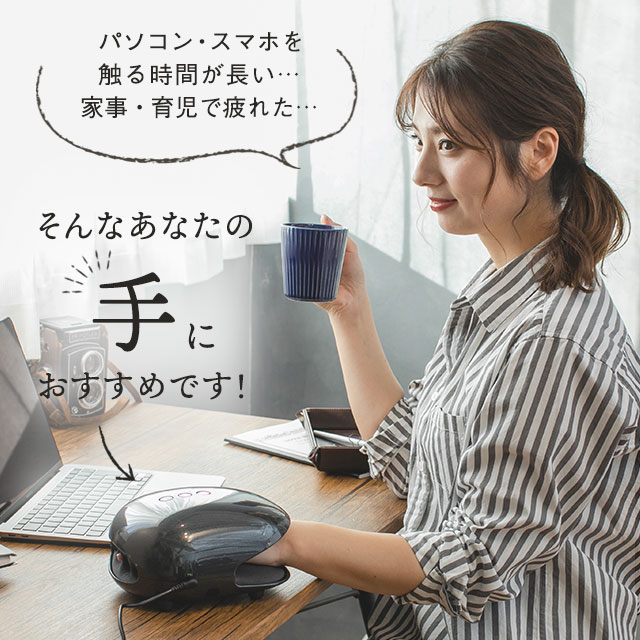 仕様 ■素材: 本体:ABS樹脂 内カバー(抗菌):ナイロン、ポリウレタン 指圧プレート:PVC ■電源:AC100V(50/60Hz) ■消費電力:12W(ヒーター5W) ■ヒーター温度: 約45℃以下 ■タイマー: 約10分自動OFF ■付属品:ACアダプター、フェイスシール、ビニール手袋 ■生産国:中国 ■保証期間:1年 サイズ・重量 ■本体サイズ: (約)W170×L185×H100mm ■重量: (約)750g(アダプター含まず) ■電源コード: (約)1.8m 医療機器認証番号 302AABZX00005000 使用目的又は効果 あんま、マッサージの代用。