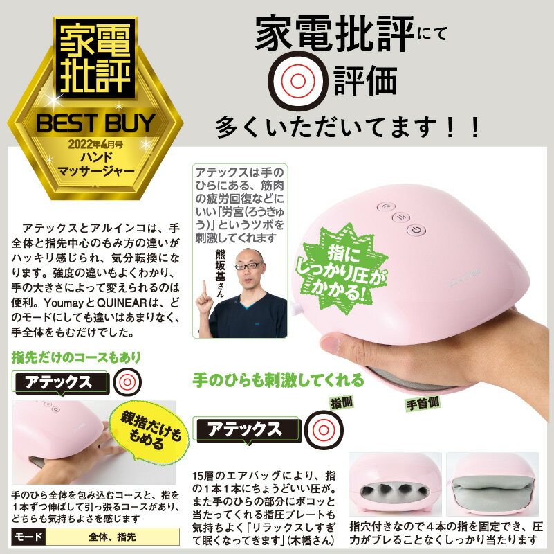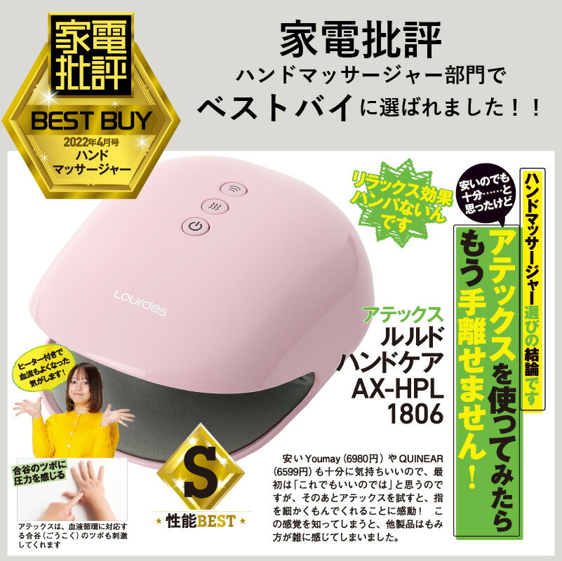 【家電批評2022年4月号(3月3日発売)にて「ルルド ハンドケア AX-HPL1806」が安くていい家電2022特集にてハンドマッサージャー部門にてベストバイ 製品に受賞いたしました!!】 仕様 ■素材: 本体:ABS樹脂 内カバー(抗菌):ナイロン、ポリウレタン 指圧プレート:PVC ■電源:AC100V(50/60Hz) ■消費電力:12W(ヒーター5W) ■ヒーター温度: 約45℃以下 ■タイマー: 約10分自動OFF ■付属品:ACアダプター、フェイスシール、ビニール手袋 ■生産国:中国 ■保証期間:1年 サイズ・重量 ■本体サイズ: (約)W170×L185×H100mm ■重量: (約)750g(アダプター含まず) ■電源コード: (約)1.8m 医療機器認証番号 302AABZX00005000 使用目的又は効果 あんま、マッサージの代用。