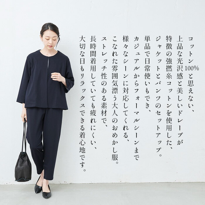 【新作】[ 接触冷感 パンツスーツ レディース セットアップ ] 強撚糸コットン100% こなれジャケット + アンクルパンツ セットアップ / 日本製 40代 50代 60代 パンツスーツ顔合わせ50代 結婚式 ブラックフォーマル 礼服 法事 七五三 母 ストレッチ【レビューでクーポン】