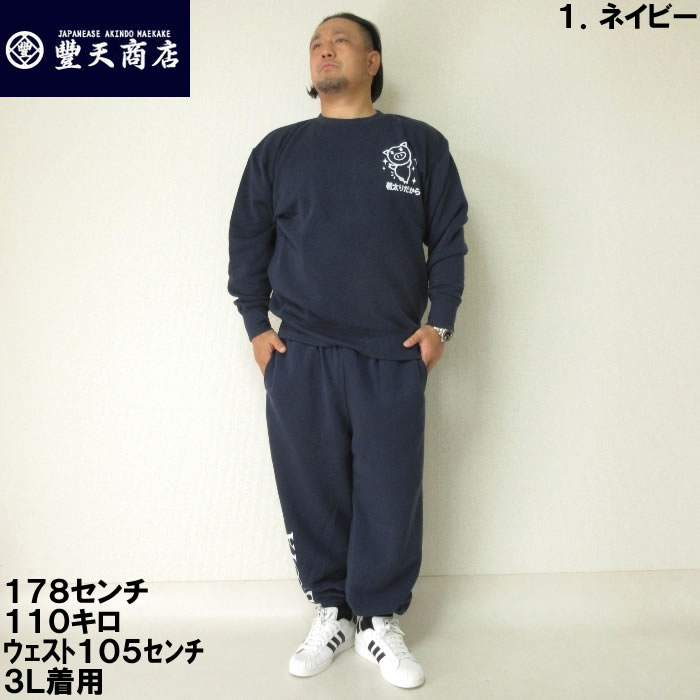 <大きいサイズデビルーズ 代表 ゆるぎ> サイズ表(トップス) 身幅 着丈 肩幅 袖丈 3L 68cm 78cm 60cm 61cm 4L 73cm 80cm 62cm 62cm 5L 78cm 82cm 64cm 63cm 6L 83cm 84cm 66cm 64cm サイズ表(ボトムス) ウェスト わたり すそ幅 前股上 股下 総丈 3L 95-110cm 42cm ●cm ●cm 78cm 114cm 4L 105-120cm 44cm ●cm ●cm 78cm 116cm 5L 115-130cm 46cm ●cm ●cm 78cm 118cm 6L 125-140cm 48cm ●cm ●cm 78cm 120cm 生産国 素材 — 本体:ポリエステル 80% 綿 20% リブ:ポリエステル 62% 綿 33% ポリウレタン 5%豊天の大人気キャラクターの ぶーちゃんがデザインされたルームウェアの上下セットです。