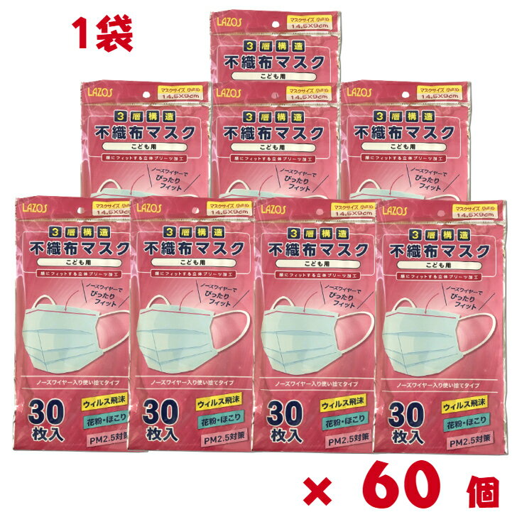 【まとめ1800枚セット】30枚入り×60個 Lazos 子供用 不織布マスク 30枚組 ブルー 三層構造 L-MSKC-30 × 60個