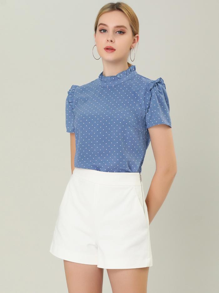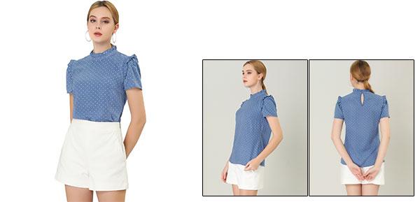 ソウテン Allegra K フリルブラウス 水玉 トップス 立ち襟 半袖 オフィス レディース ブルー XS